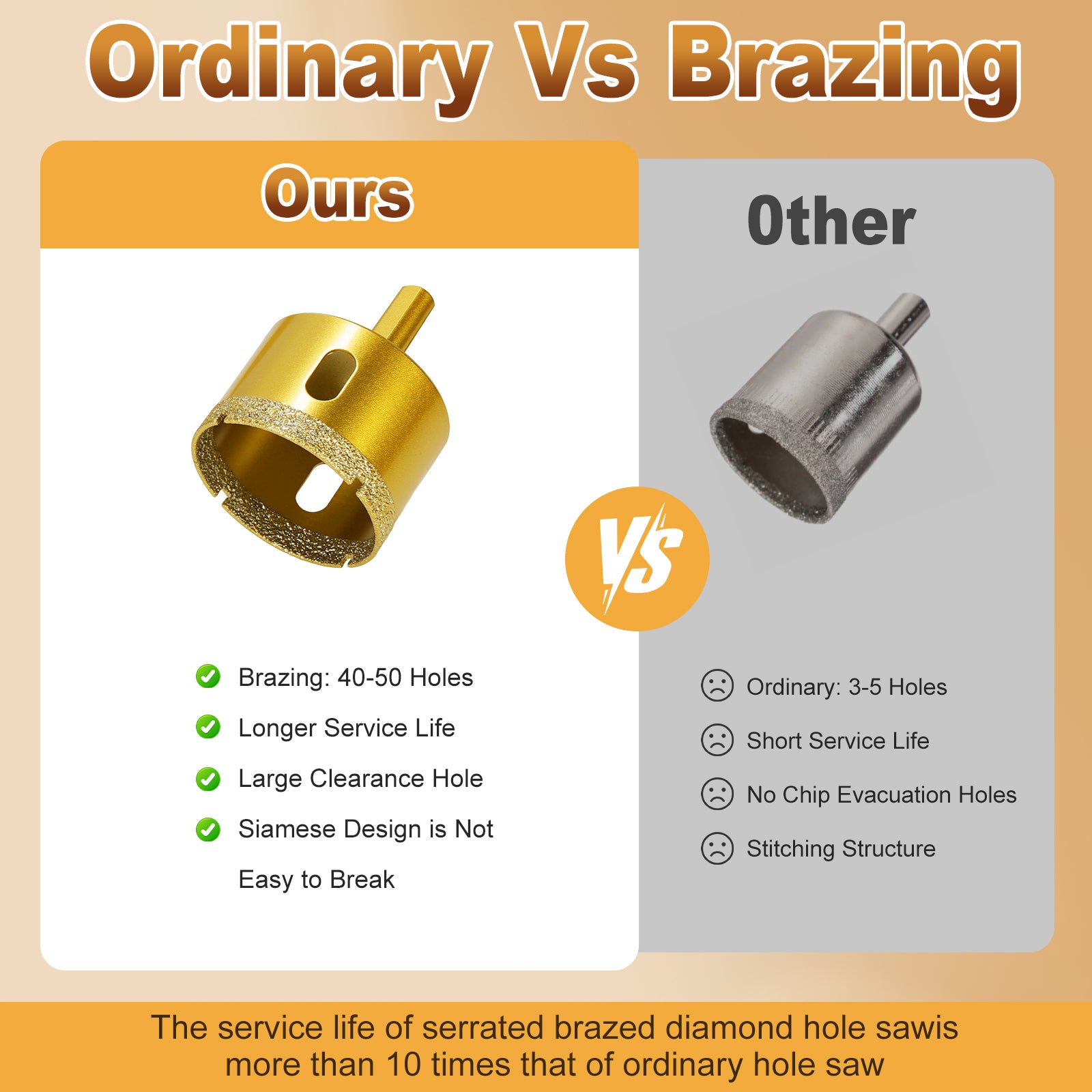 Made with diamond-integral steel and a brazed process, these hole saws are built to last. The thick diamond coating ensures fast, precise cutting through tough materials, while the brazed design resists wear and heat, offering reliable performance over time.